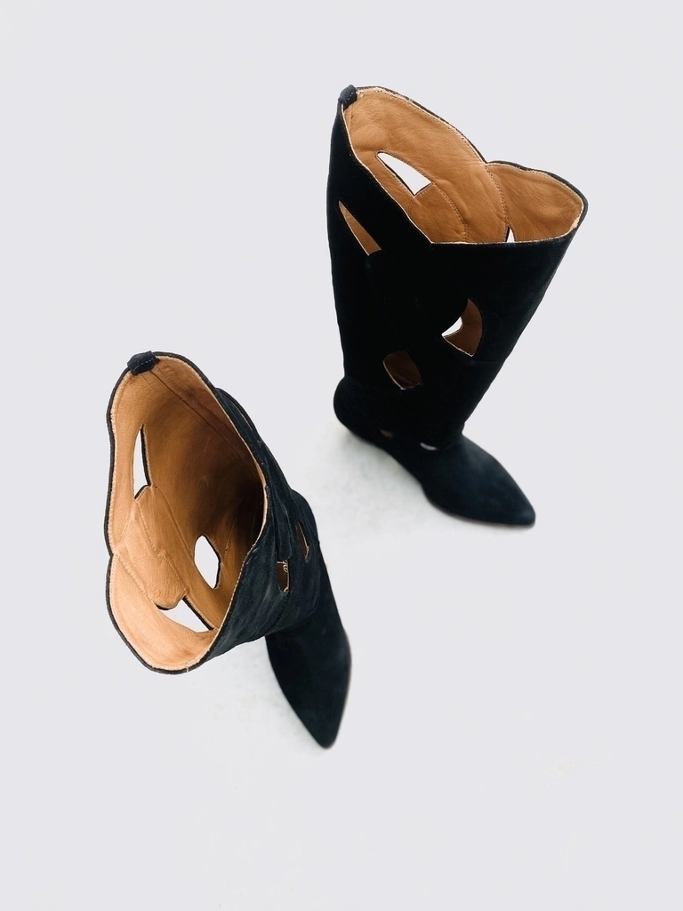 Bota Diana, inspirada en el icónico estilo de Diana Spencer y con un toque nostálgico de la década de los 80. Confeccionada en gamuza de alta calidad, esta bota no solo es un deleite visual, sino que también ofrece un confort excepcional.